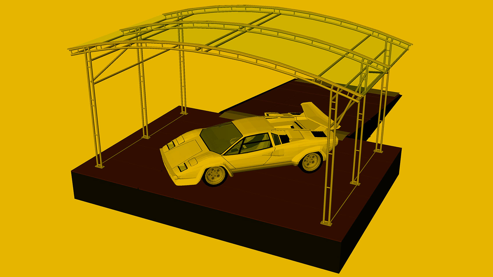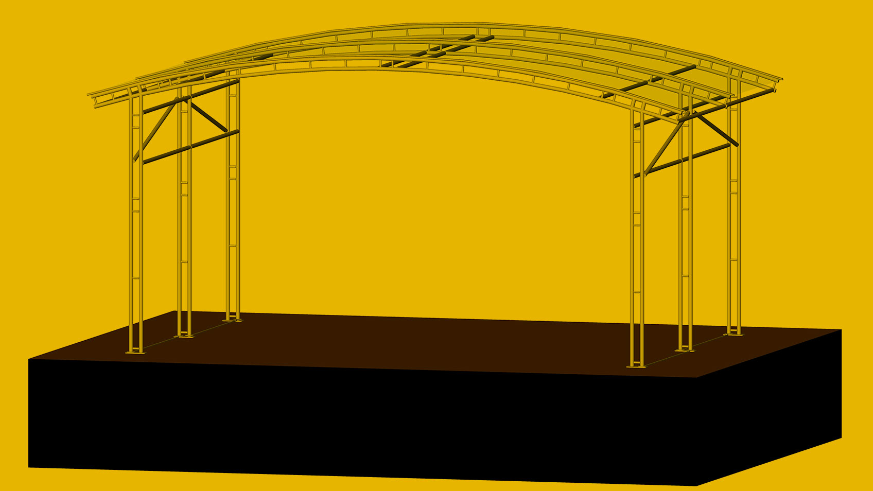 De kap zelf is maar liefst 7.4 m breed, heeft een diepte van 6.21 m en heeft een maximale clearance van 3.45 m. De afstanden tussen de poten van de loods bedragen 6.21 m en 4.14 m wat hem ideaal maakt om op een onderbouw van Layher te bouwen. De vloerhoogte wanneer de loods op een Layher deck gebouwd wordt maakt voor deze cover niet uit, aangezien deze volledig vrijstaand is.