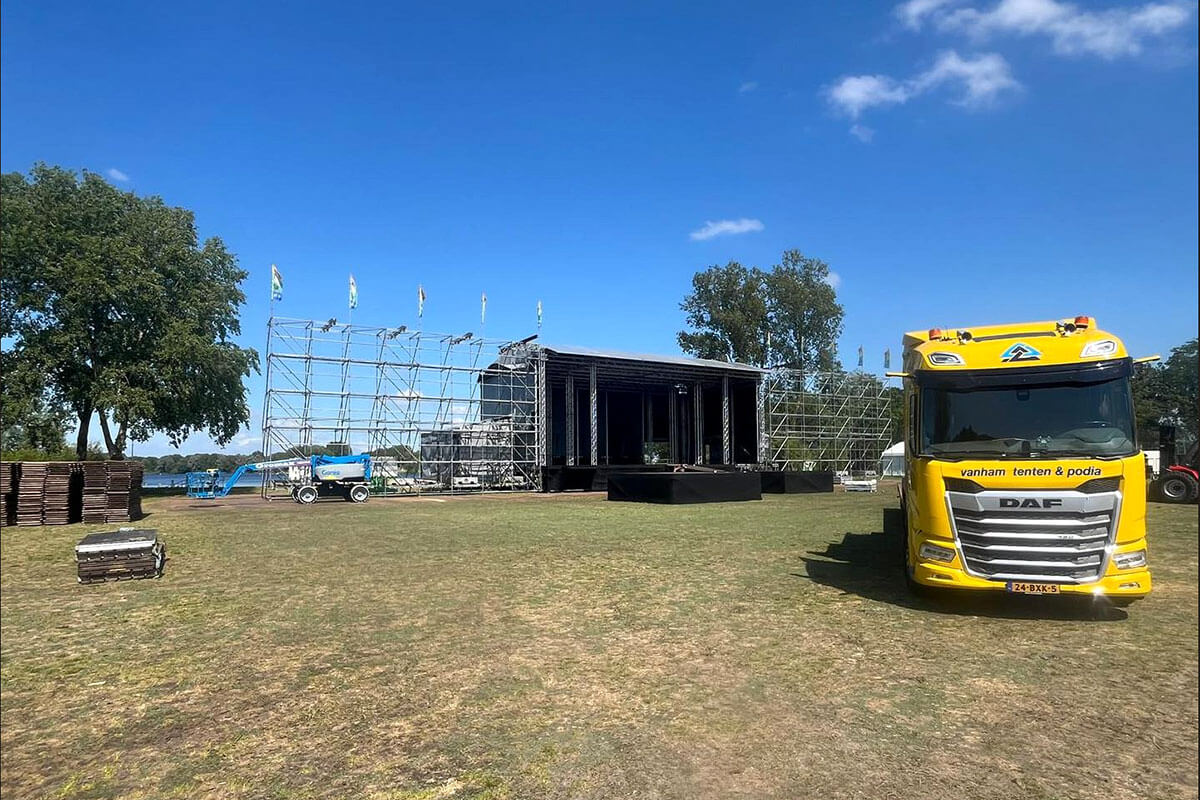 Voor het hoofdpodium is de keuze gevallen op de XLT, een overdekt podium van 22 meter breed en 11 meter diep. Dankzij de riggingcapaciteit van 8.700 kg biedt dit podium voldoende mogelijkheden voor licht, geluid en aankleding. Aan beide kanten hebben we 2 wings gebouwd van 16 meter breed, voorzien van hijsbalken en rollerbeams voor de PA-installatie en LED-schermen.