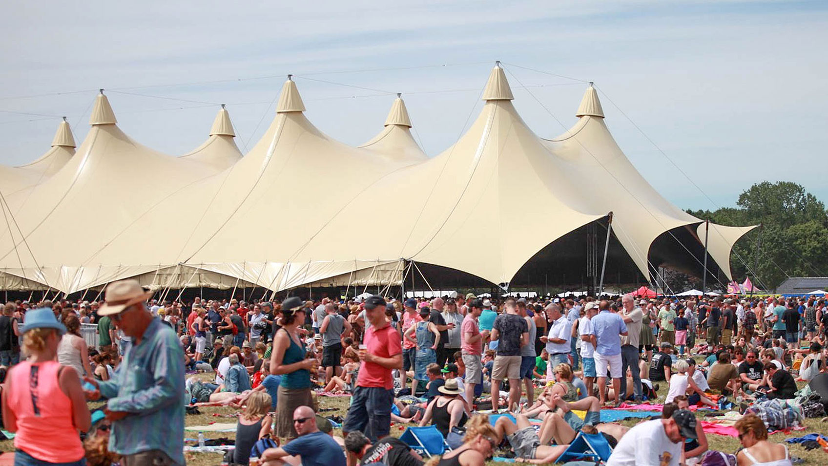 De Sahara is een sierlijke multifunctionele evenemententent van 40 meter breed, in een prachtige lichte zandkleur. De evenemententent wordt geleverd met een open kop oftewel eindstuk wat diverse toepassings-mogelijkheden biedt en waardoor het publiek buiten de tent ook aansluiting heeft met het publiek en de podiumartiesten binnen. Zo kunt u afhankelijk van het weer, het publiek, de aard van de optredens of de gewenste look, kiezen voor de beste optie m.b.t. uw evenement.